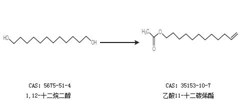 1.通過1,12-二乙酰氧基十二烷合成乙酸11-十二碳烯酯,收率約66%;