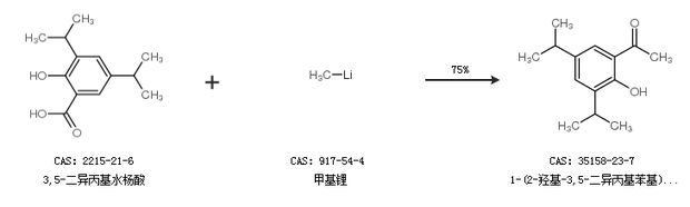 2.通過(guò)3,5-二異丙基水楊酸和甲基鋰合成1-(2-羥基-3,5-二異丙基苯基)乙酮,收率約75%;