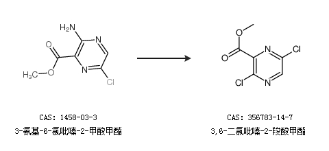1.通過3-氨基-6-氯吡嗪-2-甲酸甲酯合成3,6-二氯吡嗪-2-羧酸甲酯