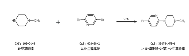 1.通過N-甲基哌嗪和2,5-二溴吡啶合成1-(5-溴吡啶-2-基)-4-甲基哌嗪,收率約97%;