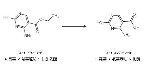1.通過(guò)4-氨基-2-巰基嘧啶-5-羧酸乙酯合成2-羥基-4-氨基嘧啶-5-羧酸