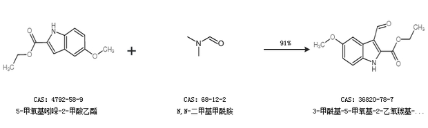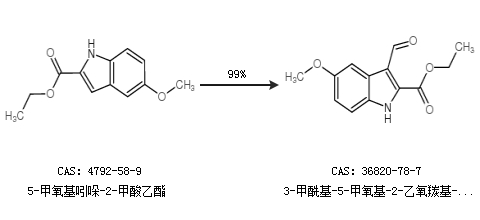 2.通過5-甲氧基吲哚-2-甲酸乙酯和N,N-二甲基甲酰胺合成3-甲?;?5-甲氧基-2-乙氧羰基-1H-吲哚,收率約91%;