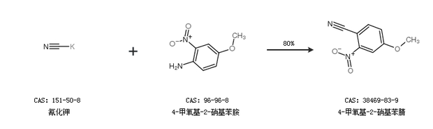 2.通過氰化鉀和4-甲氧基-2-硝基苯胺合成4-甲氧基-2-硝基苯腈,收率約80%;