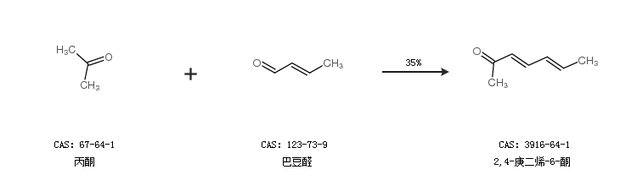 1.通過丙酮和巴豆醛合成2,4-庚二烯-6-酮,收率約35%;