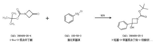 2.通過1-Boc-3-氮雜環(huán)丁酮和溴化苯基鎂合成3-羥基-3-苯基氮雜丁烷-1-羧酸叔丁酯,收率約92%;