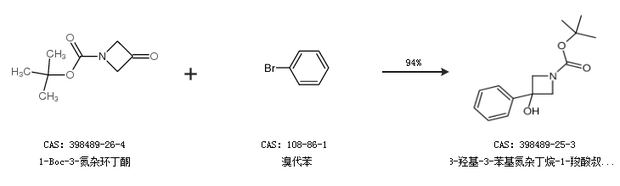 1.通過1-Boc-3-氮雜環(huán)丁酮和溴代苯合成3-羥基-3-苯基氮雜丁烷-1-羧酸叔丁酯,收率約94%;