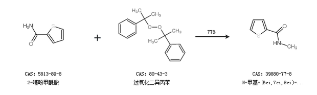 1.通過2-噻吩甲酰胺和過氧化二異丙苯合成N-甲基-(6ci,7ci,9ci)-2-噻吩羧酰胺,收率約77%;