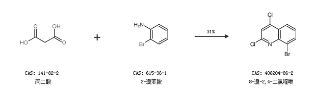 1.通過丙二酸和2-溴苯胺合成8-溴-2,4-二氯喹啉,收率約31%;