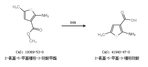 1.通過(guò)2-氨基-5-甲基噻吩-3-羧酸甲酯合成2-氨基-5-甲基-3-噻吩羧酸,收率約84%;