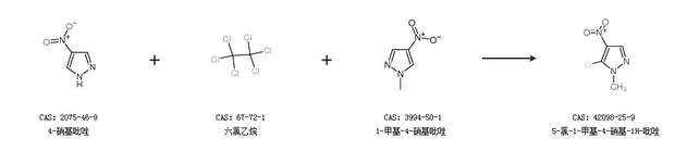 2.通過(guò)4-硝基吡唑、六氯乙烷和1-甲基-4-硝基吡唑合成5-氯-1-甲基-4-硝基-1H-吡唑