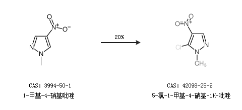 1.通過(guò)1-甲基-4-硝基吡唑合成5-氯-1-甲基-4-硝基-1H-吡唑,收率約20%;