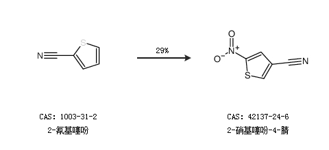 2.通過2-氰基噻吩合成2-硝基噻吩-4-腈,收率約29%;