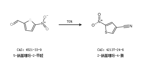 1.通過5-硝基噻吩-2-甲醛合成2-硝基噻吩-4-腈,收率約70%;