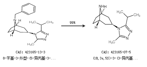 1.通過8-芐基-3-外型-(5-異丙基-3-甲基-4H-1,2,4-三唑-4-基)-8-氮雜雙環(huán)[3.2.1]辛烷合成(1R,3s,5S)-3-(3-異丙基-5-甲基-4H-1,2,4-三唑-4-基)-8-氮雜雙環(huán)[3.2.1]辛烷,收率約99%;