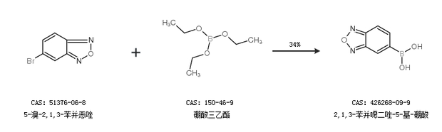 2.通過(guò)5-溴-2,1,3-苯并惡唑和硼酸三乙酯合成2,1,3-苯并噁二唑-5-基-硼酸,收率約34%;