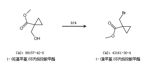 1.通過1-(羥基甲基)環(huán)丙烷羧酸甲酯合成1-(溴甲基)環(huán)丙烷羧酸甲酯,收率約91%;