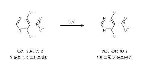 1.通過5-硝基-4,6-二羥基嘧啶合成4,6-二氯-5-硝基嘧啶,收率約80%;