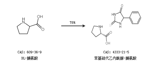 1.通過(guò)DL-脯氨酸合成苯基硫代乙內(nèi)酰脲-脯氨酸,收率約78%;
