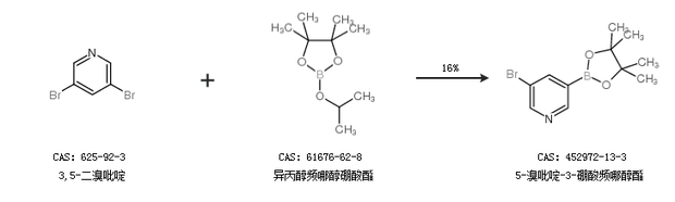 2.通過3,5-二溴吡啶和異丙醇頻哪醇硼酸酯合成5-溴吡啶-3-硼酸頻哪醇酯,收率約16%;