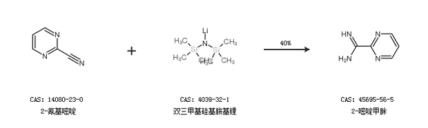 2.通過2-氰基嘧啶和雙三甲基硅基胺基鋰合成2-嘧啶甲脒,收率約40%;