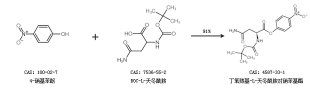 1.通過4-硝基苯酚和BOC-L-天冬酰胺合成丁氧羰基-L-天冬酰胺對(duì)硝苯基酯,收率約91%;