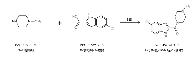 1.通過N-甲基哌嗪和5-氯吲哚-2-羧酸合成1-[(5-氯-1H-吲哚-2-基)羰基]-4-甲基哌嗪,收率約81%;
