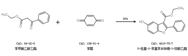1.通過(guò)苯甲酰乙酸乙酯和苯醌合成5-羥基-2-苯基苯并呋喃-3-羧酸乙酯,收率約97%;