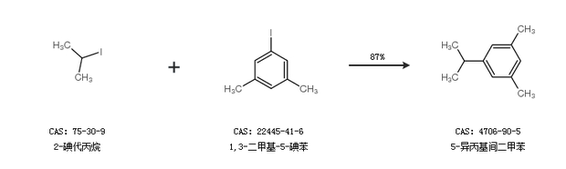2.通過2-碘代丙烷和1,3-二甲基-5-碘苯合成5-異丙基間二甲苯,收率約87%;