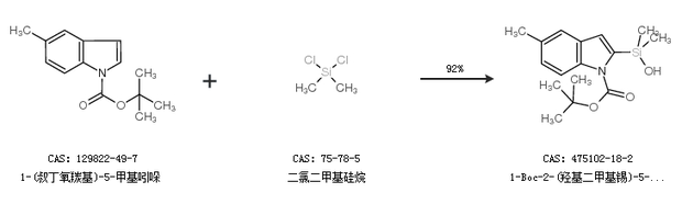 1.通過1-(叔丁氧羰基)-5-甲基吲哚和二氯二甲基硅烷合成1-Boc-2-(羥基二甲基錫)-5-甲基吲哚,收率約92%;