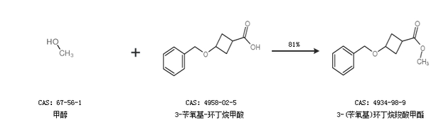 1.通過(guò)甲醇和3-芐氧基-環(huán)丁烷甲酸合成3-(芐氧基)環(huán)丁烷羧酸甲酯,收率約81%;