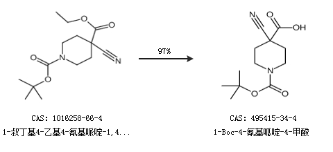 1.通過1-叔丁基4-乙基4-氰基哌啶-1,4-二羧酸合成1-Boc-4-氰基呱啶-4-甲酸,收率約97%;