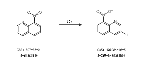 1.通過(guò)8-硝基喹啉合成3-I碘-8-硝基喹啉,收率約10%;