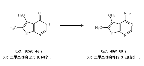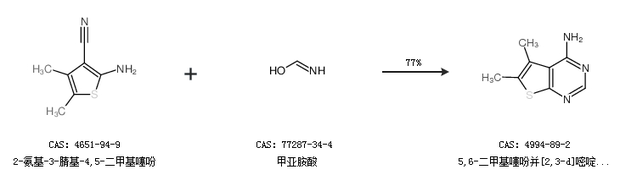1.通過2-氨基-3-腈基-4,5-二甲基噻吩和甲亞胺酸合成5,6-二甲基噻吩并[2,3-d]嘧啶-4-胺,收率約77%;
