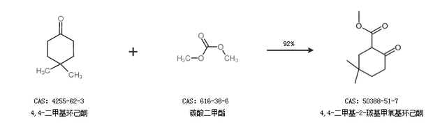 1.通過4,4-二甲基環(huán)己酮和碳酸二甲酯合成4,4-二甲基-2-羰基甲氧基環(huán)己酮,收率約92%;