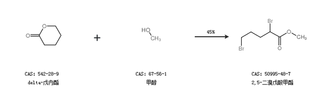 1.通過delta-戊內(nèi)酯和甲醇合成2,5-二溴戊酸甲酯,收率約45%;