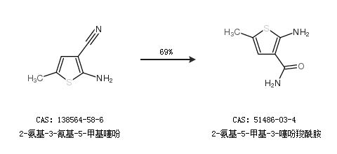 1.通過2-氨基-3-氰基-5-甲基噻吩合成2-氨基-5-甲基-3-噻吩羧酰胺,收率約69%;