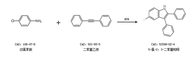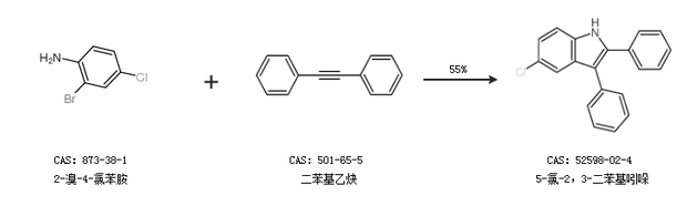 1.通過2-溴-4-氯苯胺和二苯基乙炔合成5-氯-2,3-二苯基吲哚,收率約55%;