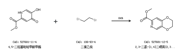 1.通過(guò)4,5-二羥基吡啶甲酸甲酯和二溴乙烷合成2,3-二氫-[1,4]二噁英[2,3-c]吡啶-7-羧酸甲酯,收率約84%;