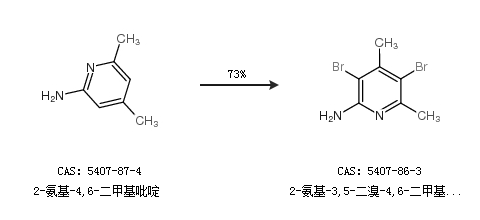 1.通過(guò)2-氨基-4,6-二甲基吡啶合成2-氨基-3,5-二溴-4,6-二甲基吡啶,收率約73%;
