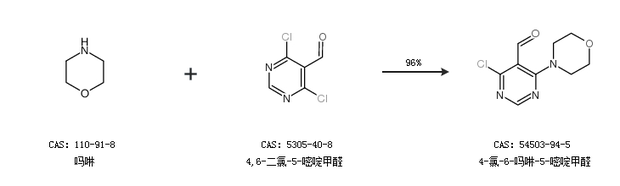 1.通過嗎啉和4,6-二氯-5-嘧啶甲醛合成4-氯-6-嗎啉-5-嘧啶甲醛,收率約96%;