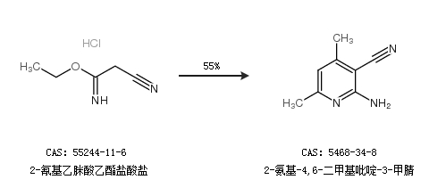 2.通過(guò)2-氰基乙脒酸乙酯鹽酸鹽合成2-氨基-4,6-二甲基吡啶-3-甲腈,收率約55%;