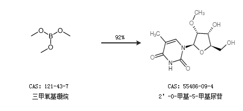 1.通過三甲氧基硼烷合成2’-O-甲基-5-甲基尿苷,收率約92%;