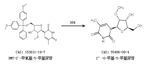 2.通過DMT-2''-甲氧基-5-甲基尿苷合成2’-O-甲基-5-甲基尿苷,收率約38%;