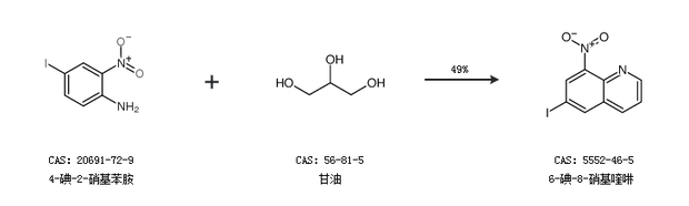 1.通過4-碘-2-硝基苯胺和甘油合成6-碘-8-硝基喹啉,收率約49%;