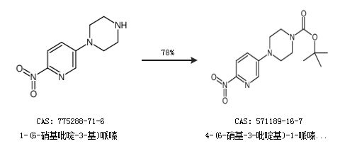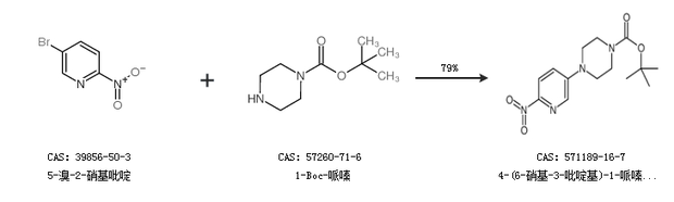 2.通過5-溴-2-硝基吡啶和1-Boc-哌嗪合成4-(6-硝基-3-吡啶基)-1-哌嗪甲酸叔丁酯,收率約79%;