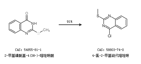 1.通過2-甲基磺酰基-4(3H-)-喹唑啉酮合成4-氯-2-甲基硫代喹唑啉,收率約91%;