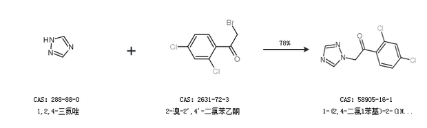 英文別名 2-(1H-1,2,4-triazol-1-yl)-2'',4''-dichloroacetophenone;1-(2,4-dichlorophenyl)-2-(1,2,4-1H-triazol-1-yl)ethanone;2'',4''-dichloro-2-(1H-1,2,4-triazol-1-yl)acetophenone;2-(1,2,4-triazol-1-yl)-2'',4''-dichloroacetophenone;1-(2,4-dichlorophenyl)-2-(1H-1,2,4-triazol-1-yl)ethanone;2'',4''-Dichloro-2-(1,2,4 triazol-1yl) acetophenone;2,4-dichlorophenyl (1H-1,2,4-triazol-1-ylmethyl) ketone;