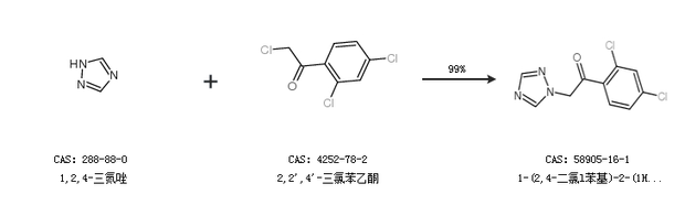 1.通過1,2,4-三氮唑和2,2'',4''-三氯苯乙酮合成1-(2,4-二氯l苯基)-2-(1H-1,2,4-噻唑-1-基)-乙酮,收率約99%;