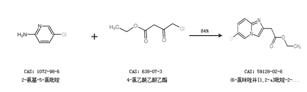 1.通過2-氨基-5-氯吡啶和4-氯乙酰乙酸乙酯合成(6-氯咪唑并[1,2-a]吡啶-2-基)-乙酸乙酯,收率約84%;