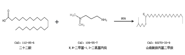 1.通過(guò)二十二酸和N,N-二甲基-1,3-二氨基丙烷合成山崳酰胺丙基二甲胺,收率約95%;